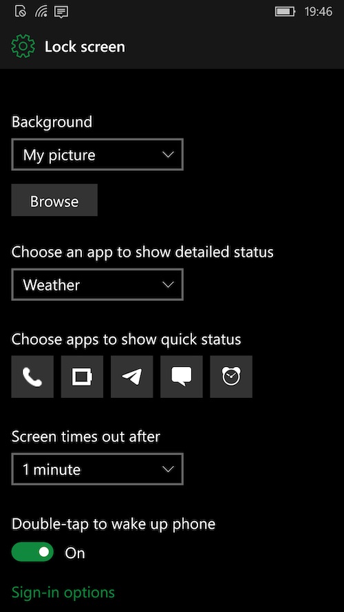 5) GLANCE SCREEN (Always-on display): it is still working, and you can display up to 5 apps' quick status, according to the personalization settings under the “Lock Screen” menu. As my favourite 5, I choose to show the status of Phone, Battery Bar Graph app, Unigram app, Messages, and Clock & Alarms. Plus, you can choose an app to show detailed status. My choice is the Microsoft Weather app, because it can display in the lock screen (and same in Glance screen) up to three lines of weather content.
